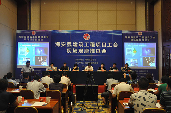8月18日,海安縣建筑工程項(xiàng)目工會現(xiàn)場觀摩推進(jìn)會在石家莊太行國賓館召開。縣委常委、宣傳部部長嚴(yán)長江、市總工會副主席楊嘩娟、市建設(shè)局副局長楊娟、市建設(shè)行業(yè)工會主席朱小成、縣總工會黨組書記、副主席柴寶清、縣建管局局長賈伯根、副局長、工會主席徐培鴻等領(lǐng)導(dǎo)出席了會議。達(dá)欣集團(tuán)董事、副總經(jīng)理?xiàng)铎o、工會副主席吉春勤以及全縣一級資質(zhì)以上的建筑企業(yè)工會主席、海安駐石建筑企業(yè)部分代表100多人參加了會議。