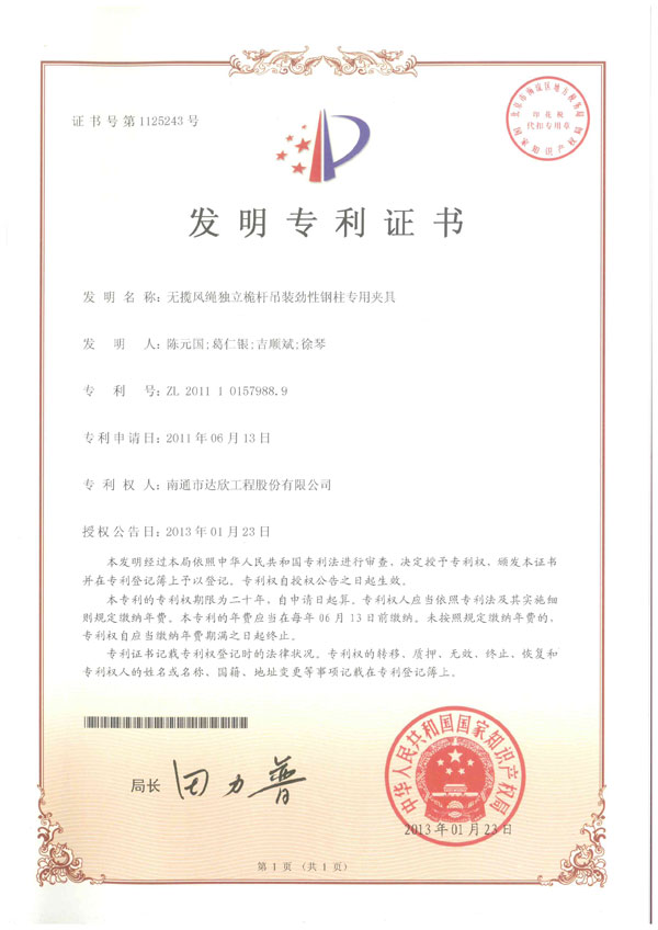 國家知識產(chǎn)權(quán)局對我公司申報的專利成果“無攬風(fēng)繩獨立桅桿吊裝勁性鋼柱專用夾具”,授予了發(fā)明型專利證書,這是我公司首次獲得此類型專利,標(biāo)志著公司專利成果的水平躍上新的臺階。