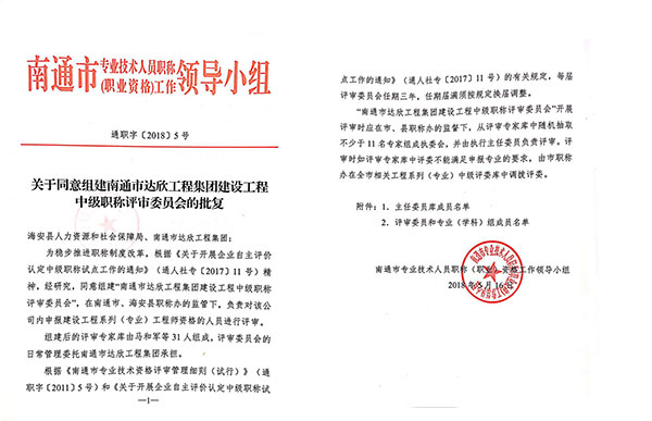 自2018年起,達(dá)欣集團(tuán)將在縣、市職稱辦的領(lǐng)導(dǎo)下,自主對本公司內(nèi)申報國家級建設(shè)工程系列(專業(yè))工程師資格的人員進(jìn)行評審。只要符合中級職稱申報條件,均可在南通職稱網(wǎng)通過“南通市達(dá)欣工程集團(tuán)建設(shè)工程中級專業(yè)技術(shù)資格評審委員會”進(jìn)行申報。此次公司獲得中級職稱自主評價認(rèn)定資格,既是上級主管部門對公司人才管理工作的肯定,也是公司近年來重視實施人才戰(zhàn)略,加快人才引進(jìn)與培養(yǎng),企業(yè)技術(shù)人員綜合素養(yǎng)水平能力不斷提高的有效體現(xiàn)
