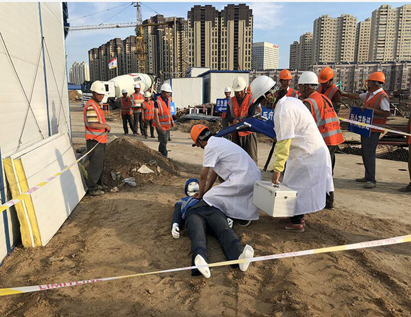 此次應急救援預案演練模擬施工工人從高處墜落?!耙馔狻卑l(fā)生后,現(xiàn)場負責人立即組織人員撤出危險區(qū),并在匯報情況后聽從指示在第一時間啟動應急預案。在應急總指揮的指令下,救援小組迅速就位,并有序展開警戒護衛(wèi)、技術排險、現(xiàn)場搶險、醫(yī)療救護等各項救援工作,使險情得到有效控制,隨后,傷員被送往醫(yī)院進行救治。