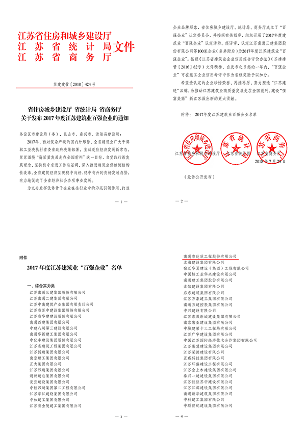 江蘇建筑業(yè)“百?gòu)?qiáng)企業(yè)”是由省建設(shè)廳、省統(tǒng)計(jì)局、省商務(wù)廳成立的“百?gòu)?qiáng)企業(yè)”認(rèn)定委員會(huì)評(píng)議認(rèn)定,從企業(yè)營(yíng)業(yè)額等經(jīng)濟(jì)類指標(biāo)、質(zhì)量安全、技術(shù)創(chuàng)新指標(biāo)等方面進(jìn)行綜合評(píng)定,旨在充分發(fā)揮優(yōu)勢(shì)企業(yè)在全行業(yè)中的引領(lǐng)和示范作用,打造建筑企業(yè)品牌,提升核心競(jìng)爭(zhēng)力,是權(quán)威性的政府評(píng)選。同時(shí)按照《江蘇省建筑業(yè)企業(yè)信用綜合評(píng)價(jià)辦法》(蘇建建管〔2016〕82號(hào))文件精神,自發(fā)布之日起的一年內(nèi),“百?gòu)?qiáng)企業(yè)”可在施工企業(yè)信用考評(píng)中作為省級(jí)獎(jiǎng)勵(lì)予以加分。