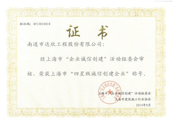 日前,由上海市建筑施工行業(yè)協(xié)會(huì)推薦,上海市“企業(yè)誠(chéng)信創(chuàng)建”活動(dòng)組委會(huì)審核,第三方征信機(jī)構(gòu)嚴(yán)格查證,第一工程公司在2013年榮獲“三星級(jí)誠(chéng)信創(chuàng)建企業(yè)”后,今年再加一顆星,被授予上海市“四星級(jí)誠(chéng)信創(chuàng)建企業(yè)”稱(chēng)號(hào)。