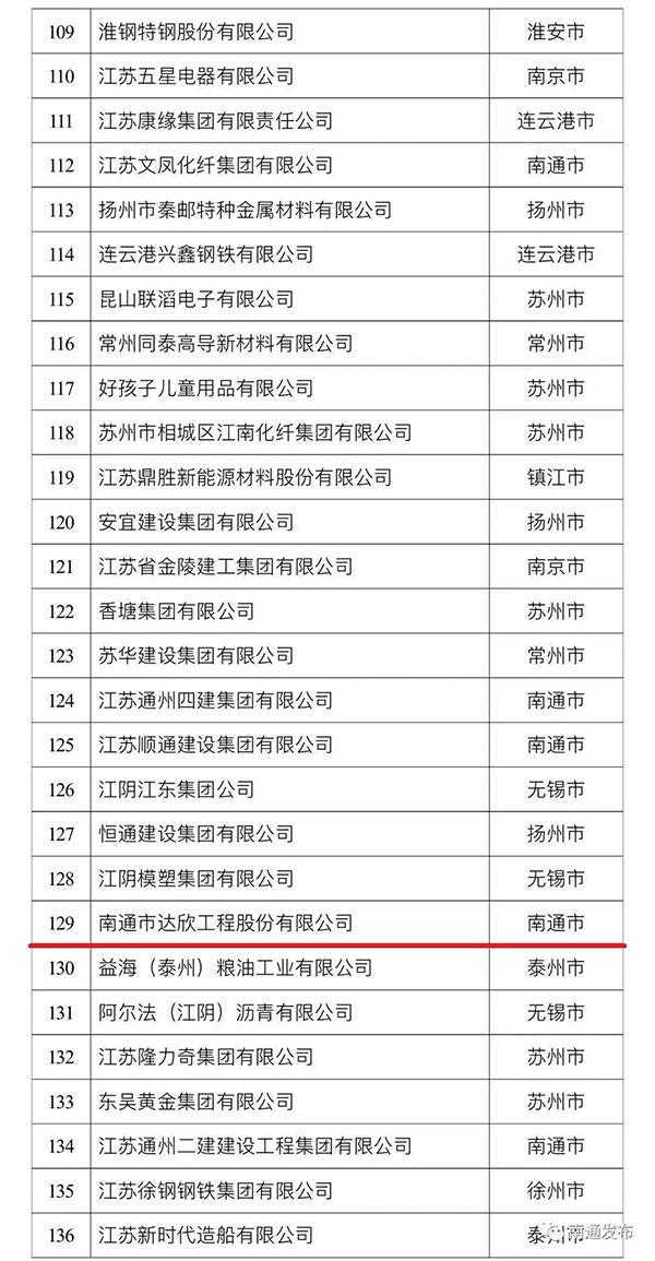 9月21日,由江蘇省工商聯(lián)發(fā)布的最新民營企業(yè)200強名單出爐。達欣集團首次入圍,排位129位。本次南通民企入圍總數(shù)為32家,海安建筑企業(yè)3家。