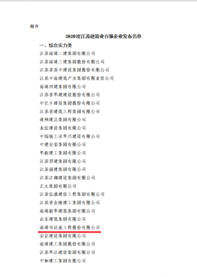 江蘇省住房城鄉(xiāng)建設(shè)廳、江蘇省統(tǒng)計局、江蘇省商務(wù)廳聯(lián)合發(fā)布2020年度全省建筑業(yè)“百強企業(yè)”名單,南通市達欣工程股份有限公司以卓有成效的業(yè)績連續(xù)七年榮登百強企業(yè)榜單,綜合實力類排名第22名。