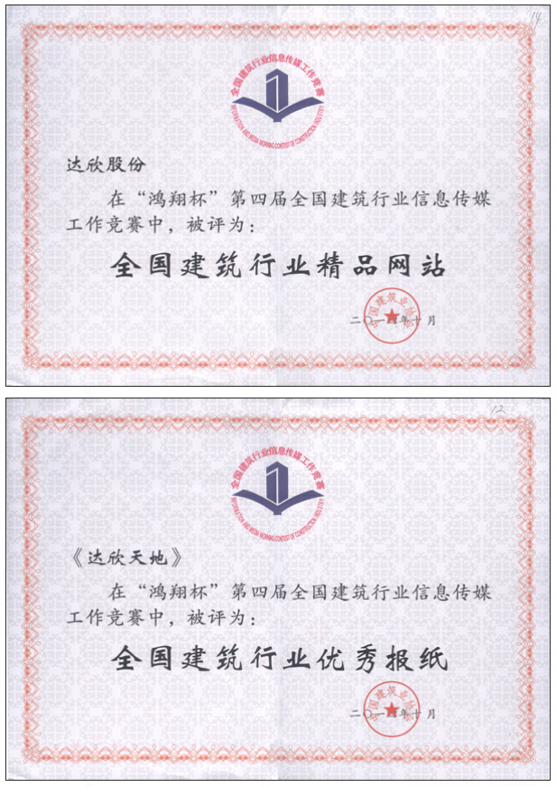 青海省建筑業(yè)協(xié)會副會長兼秘書長許光科致辭。中國建筑業(yè)協(xié)會副秘書長趙峰講話。江蘇省建筑市場管理協(xié)會會長汪士和、浙江省建筑行業(yè)協(xié)會副會長吳漢忠等領導出席了會議。會上向“鴻翔杯”第四屆全國建筑行業(yè)信息傳媒工作競賽的優(yōu)勝者頒發(fā)牌證?!斑_欣股份”企業(yè)網(wǎng)站榮獲全國建筑行業(yè)精品網(wǎng)站、 “達欣天地”企業(yè)報紙榮獲全國建筑行業(yè)優(yōu)秀報紙。