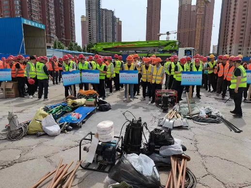 第三工程公司接到通知后,以副經(jīng)理吉祥為組長(zhǎng)的應(yīng)急救援小組及時(shí)出動(dòng),攜帶水泵、發(fā)電機(jī)、鐵鍬、頭燈、沙袋、雨靴等防汛物資,參加演練。