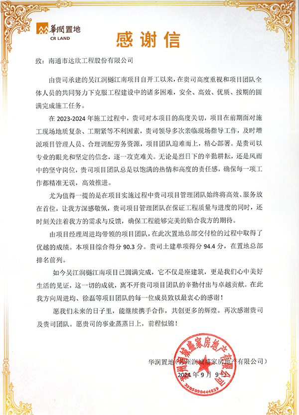 近日,公司收到華潤置地發(fā)來的感謝信,信中對集團第一工程公司承建的吳江潤樾江南項目在施工過程中攻堅克難,嚴(yán)把安全生產(chǎn)關(guān),促進(jìn)項目履約,為華潤置地高質(zhì)量發(fā)展作出的貢獻(xiàn)表示感謝。