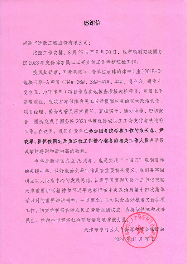 近日,第六工程公司承建的津?qū)帲⊕欤?018-04地塊項目三期工程代表天津市參加2023年度國家級省際交叉核查,在國務(wù)院針對省級根治欠薪工作整體情況的檢查中成績優(yōu)異,榮獲“標(biāo)桿項目”榮譽(yù)稱號,并對迎檢過程中全體工作人員真抓實干、通力協(xié)作的精神表示感謝。