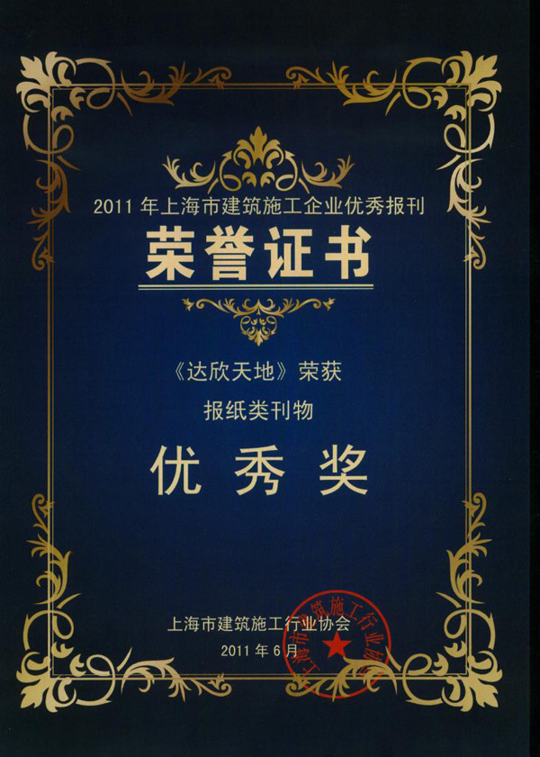 2011年上海市建筑施工企業(yè)優(yōu)秀報刊及協(xié)會優(yōu)秀通訊員表彰會日前召開,由上海市建筑施工企業(yè)優(yōu)秀報刊評委會評選,公司創(chuàng)辦的“達(dá)欣天地”報榮獲2011年上海市建筑施工企業(yè)優(yōu)秀報刊獎。
