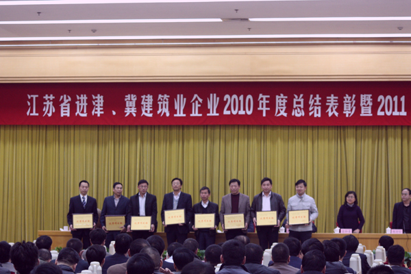 2011年3月20日,江蘇省進津、冀建筑業(yè)企業(yè)2010年度總結表彰暨2011年工作大會在天津大禮堂隆重召開。大會由江蘇省建設廳駐天津辦事處副主任韓勁松主持,主任鄧福林作了“搶抓新機遇,謀劃新發(fā)展,不斷開創(chuàng)江蘇建筑業(yè)新局面”的工作報告,對2010年的工作進行回顧,并提出2011年工作目標任務。江蘇省建筑工程管理局副局長紀迅、天津市外地施工隊伍管理站站長吳海、江蘇省住房和城鄉(xiāng)建設廳監(jiān)察室主任王毅、計劃賬務處調研員徐和美等江蘇省、天津市的主管部門領導應邀出席了會議,紀迅局長、吳海站長作了重要講話。