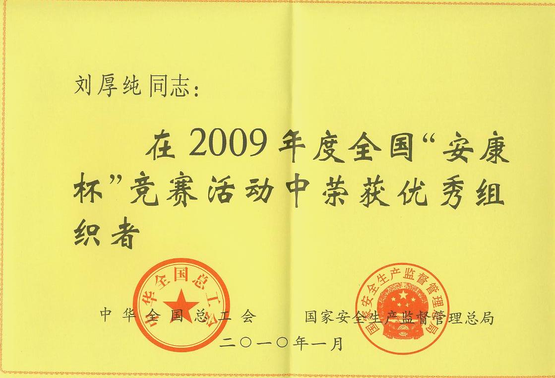 中華全國(guó)總工會(huì)、國(guó)家安全生產(chǎn)監(jiān)督管理總局聯(lián)合發(fā)文,公司黨委書(shū)記、副董事長(zhǎng)劉厚純獲得2009年度全國(guó)“安康杯”競(jìng)賽活動(dòng)優(yōu)秀組織者稱號(hào)。