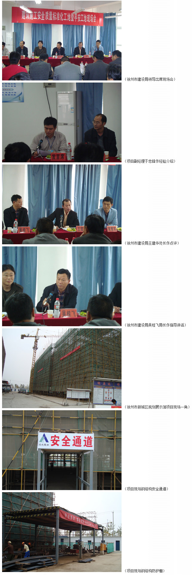 徐州市建設(shè)局安監(jiān)處王建華處長在講話中對本工程“創(chuàng)質(zhì)量安全標(biāo)準(zhǔn)化、平安工地”給予了高度評價,并總結(jié)了“八大亮點(diǎn)”:1、現(xiàn)場道路及場地硬化到位;2、農(nóng)民工學(xué)校的內(nèi)容具體、真實(shí);3、現(xiàn)場的警示標(biāo)志形象、生動,有特點(diǎn);4、腳手架搭設(shè)規(guī)范;5、現(xiàn)場排水溝及集水井嚴(yán)格按照J(rèn)GJ59—99的要求設(shè)計(jì)、施工;6、定型化產(chǎn)品(組裝式鋼結(jié)構(gòu)防護(hù)棚)的投入使用;7、現(xiàn)場的臨邊防護(hù)規(guī)范;8、設(shè)置曝光欄有特點(diǎn),做到處罰有根據(jù)。
