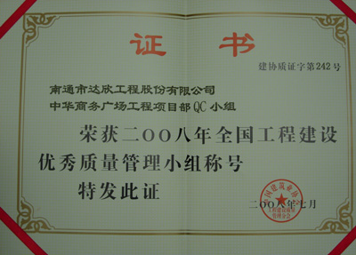2008年7月6日,由中國建筑業(yè)協(xié)會組織的2008年度全國工程建設(shè)優(yōu)秀質(zhì)量管理(QC)小組活動成果發(fā)布會在廣西桂林落下帷幕,我公司中華商務(wù)廣場工程項目部QC小組作為河北省推薦的十二個省級QC小組之一參加了會議并榮獲全國工程建設(shè)優(yōu)秀QC小組。這是我公司以“達(dá)欣”品牌獲得的第一項國家級 QC成果獎。