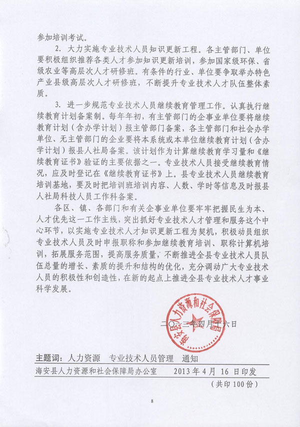 (4)報送材料地點(diǎn):海安縣人社局科技人員工作科,西四樓406室(初定、高級評審)、408室(初、中級評審),(地址:海安縣城長江東路10號)。聯(lián)系電話:88926280。
