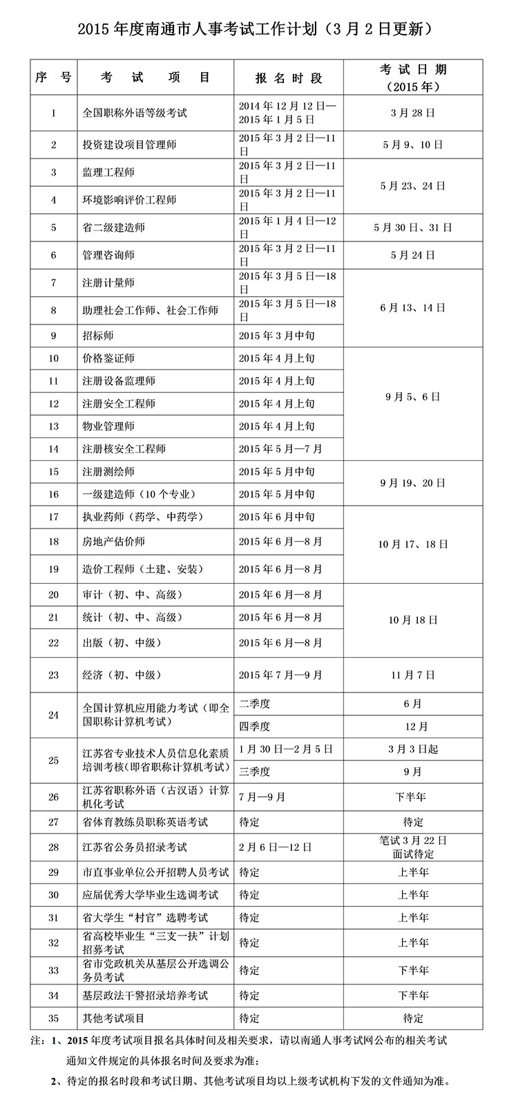 2015年度南通市人事考試工作計(jì)劃