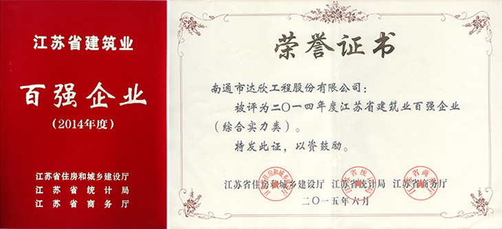 為充分發(fā)揮優(yōu)勢企業(yè)在全行業(yè)中的引領(lǐng)和示范作用,打造建筑企業(yè)品牌,提升核心競爭力,省住房城鄉(xiāng)建設(shè)廳、統(tǒng)計(jì)局、商務(wù)廳成立了“百強(qiáng)企業(yè)”認(rèn)定委員會,本著“尊重事實(shí)、嚴(yán)格標(biāo)準(zhǔn)、規(guī)范程序、公平公正”的原則,組織開展了2014年度建筑業(yè)“百強(qiáng)企業(yè)”(企業(yè)包括總承包綜合實(shí)力類、建筑裝飾裝修類、建筑鋼結(jié)構(gòu)類、建筑安裝類、基礎(chǔ)設(shè)施類等)認(rèn)定工作。經(jīng)評議,公司首度榮登2014年江蘇省建筑業(yè)“百強(qiáng)企業(yè)”。按照《江蘇省建筑業(yè)企業(yè)信用綜合評價(jià)辦法》(蘇建建管〔2013〕602號)文件精神,自發(fā)布之日起的一年內(nèi),“百強(qiáng)企業(yè)”可在施工企業(yè)信用考評中做為省級獎(jiǎng)項(xiàng)予以加分。